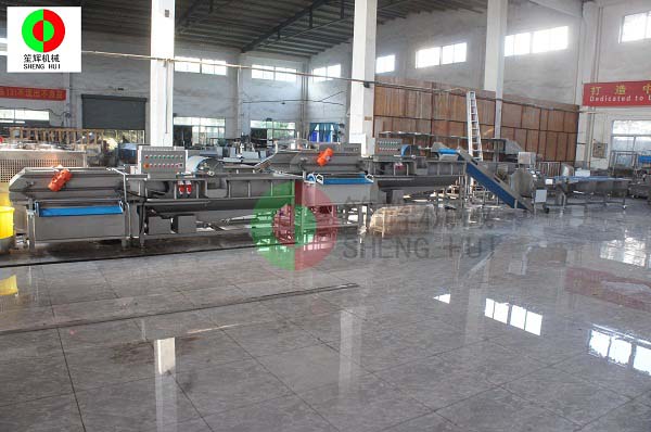 其中一條生產線是(氣泡洗菜機預浸泡--6人分選--切割--提升--純氧源高濃臭氧混合渦流洗菜機清洗--紅外線殺毒和預制冷保鮮二級渦流洗菜機清洗--脫水)。
