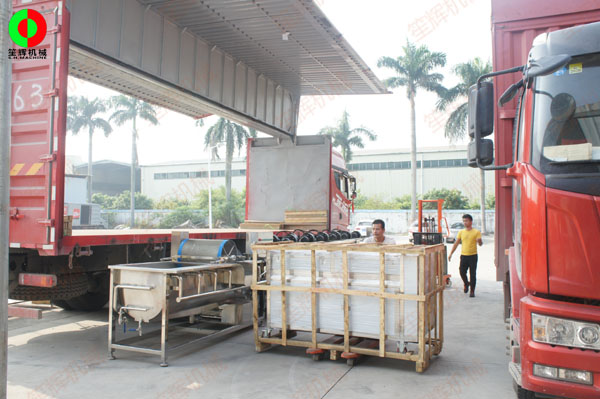 內陸客戶王先生,月前訂購的一條蔬菜加工處理生產線正式完工交貨。生產線從6人分選輸送,到兩級渦流洗菜機組進行清洗,然后提升輸送到風干機組進行風干脫水處理??蛻敉瑫r定購一批毛刷清洗去皮機,包裝機、氣泡洗菜機,及相關定制平面工作臺等。