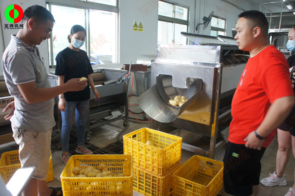 連續(xù)式土豆去皮機(jī)針對(duì)客戶帶來(lái)的大批土豆現(xiàn)場(chǎng)進(jìn)行加工處理測(cè)試!