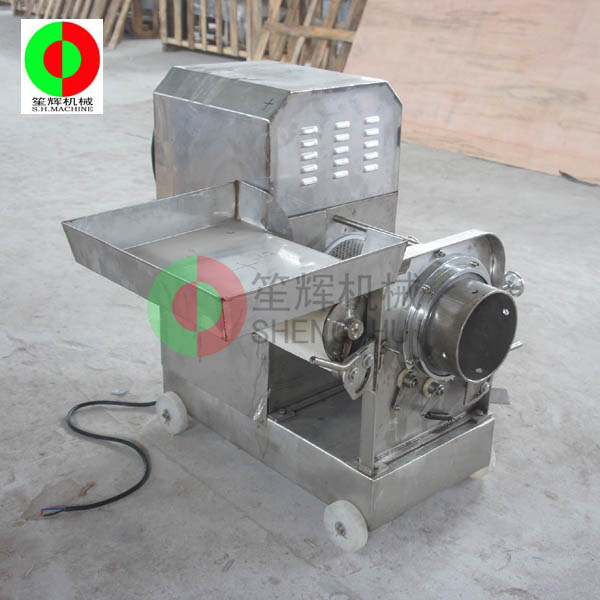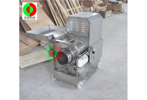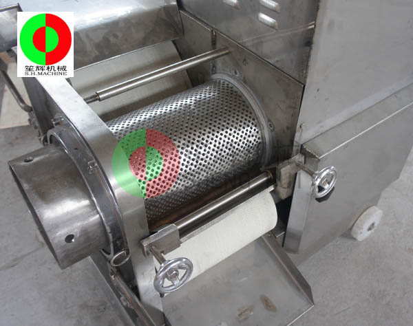 工作原理:人工把待加工的魚先去掉魚頭和取出魚肚中的內臟;對大魚,則需將魚剖分成兩半,漂洗干凈(避免采出來的魚漿被內臟及魚血污染)。隨后將魚片投入到料斗內(魚的剖分面朝向采取筒,背部貼近橡膠帶),魚在橡膠帶的帶動下進入采取筒與橡膠帶的擠壓區,在橡膠帶與采取筒之間的擠壓力的作用下,魚肉被擠壓通過采取筒上的小孔進入采取筒內,采取筒內的魚肉碎粒會隨著旋轉自動送出。而魚皮及魚刺等雜物則被裝在機器上的刮刀從采取筒外延上刮下落在收集槽中。整個采肉分離過程無需人手操作。橡膠帶與采取筒之間的壓力大小,是由位于機器頭部的橡膠帶拉緊裝置調節。調節量的大小可根據魚種的大小靈活調整。提取出來的魚肉可作為魚丸、魚漿,魚醬,魚肉餅,魚餡餃等等食品原料,大大提高魚類經濟價值。