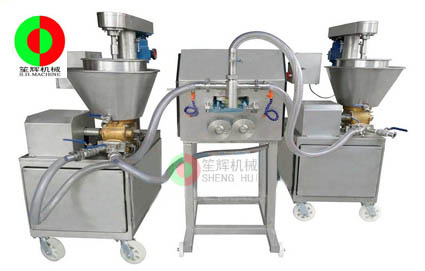 成型泵浦機主要是配合多功能成型機或者海螺丸成型機使用,主要祈禱填充、灌漿的功能。機器采用不銹鋼材料制造,符合衛(wèi)*生標準。合理的齒輪泵腔設計使 流量壓力大、灌漿穩(wěn)定,雙層保溫冷卻裝置,大容量冰鎮(zhèn)保溫層,使料斗漿體長時間生產(chǎn)也保持新鮮不流失營養(yǎng)。采用雙調(diào)速裝置,流量可調(diào)操作人性化,采用送料、泵體分別調(diào)速電機控制,可操控性高。本機配合各種功能型主機可靈活運用于各種產(chǎn)品成型,快裝式結(jié)構(gòu)更加突出生產(chǎn)應變,是生產(chǎn)冷凍調(diào)理食品的理想設備。 本機還可灌制夾心香腸、熱狗腸、鮑魚片等產(chǎn)品。適合肉制品加工廠、速凍食品加工廠等單位使用。