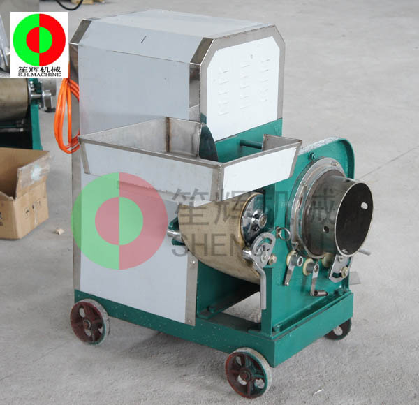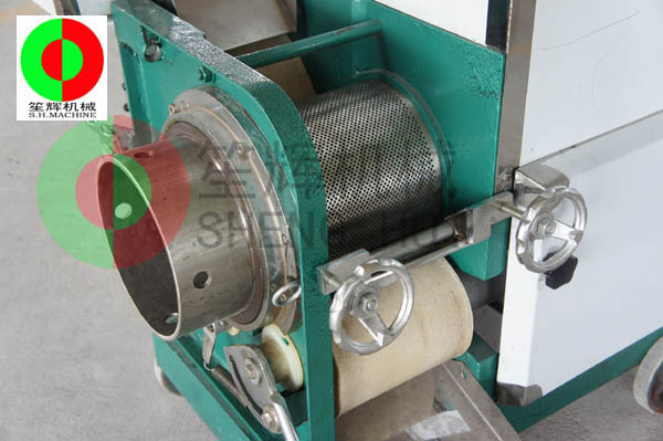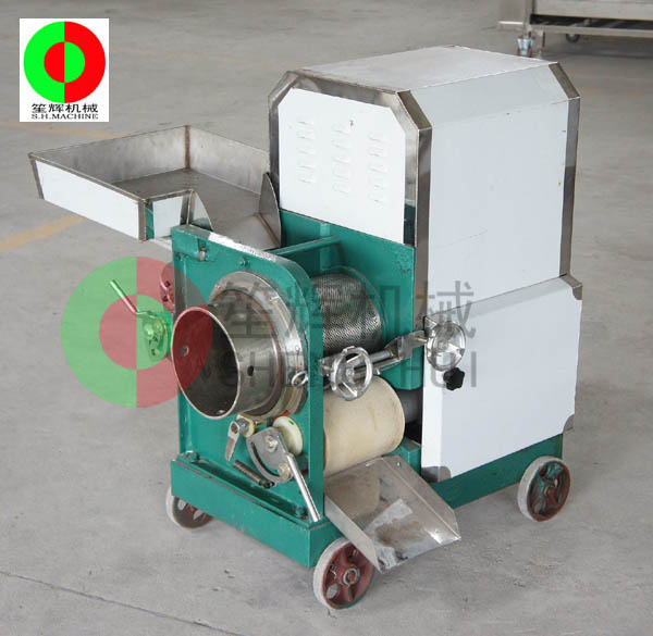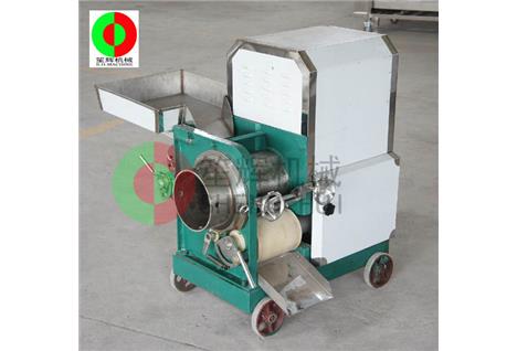 魚肉提取機的工作原理:人工把待加工的魚先去掉魚頭和取出魚肚中的內臟;對大魚,則需將魚剖分成兩半,漂洗干凈(避免采出來的魚漿被內臟及魚血污染)。隨后將魚片投入到料斗內(魚的剖分面朝向采取筒,背部貼近橡膠帶),魚在橡膠帶的帶動下進入采取筒與橡膠帶的擠壓區,在橡膠帶與采取筒之間的擠壓力的作用下,魚肉被擠壓通過采取筒上的小孔進入采取筒內,采取筒內的魚肉碎粒會隨著旋轉自動送出。而魚皮及魚刺等雜物則被裝在機器上的刮刀從采取筒外延上刮下落在收集槽中。整個采肉分離過程無需人手操作,方便衛*生。橡膠帶與采取筒之間的壓力大小,是由位于機器頭部的橡膠帶拉緊裝置調節。調節量的大小可根據魚種的大小靈活調整。提取出來的魚肉可作為魚丸、魚漿,魚醬,魚肉餅,魚餡餃等等食品原料,大大提高魚類經濟價值。