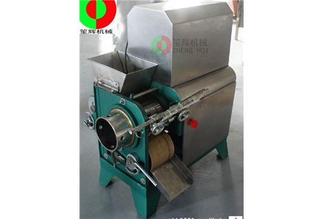 工作原理:人工把待加工的魚先去掉魚頭和取出魚肚中的內臟;對大魚,則需將魚剖分成兩半,漂洗干凈(避免采出來的魚漿被內臟及魚血污染)。隨后將魚片投入到料斗內(魚的剖分面朝向采取筒,背部貼近橡膠帶),魚在橡膠帶的帶動下進入采取筒與橡膠帶的擠壓區,在橡膠帶與采取筒之間的擠壓力的作用下,魚肉被擠壓通過采取筒上的小孔進入采取筒內,采取筒內的魚肉碎粒會隨著旋轉自動送出。而魚皮及魚刺等雜物則被裝在機器上的刮刀從采取筒外延上刮下落在收集槽中。整個采肉分離過程無需人手操作,方便衛*生。橡膠帶與采取筒之間的壓力大小,是由位于機器頭部的橡膠帶拉緊裝置調節。調節量的大小可根據魚種的大小靈活調整。提取出來的魚肉可作為魚丸、魚漿,魚醬,魚肉餅,魚餡餃等等食品原料,大大提高魚類經濟價值。
